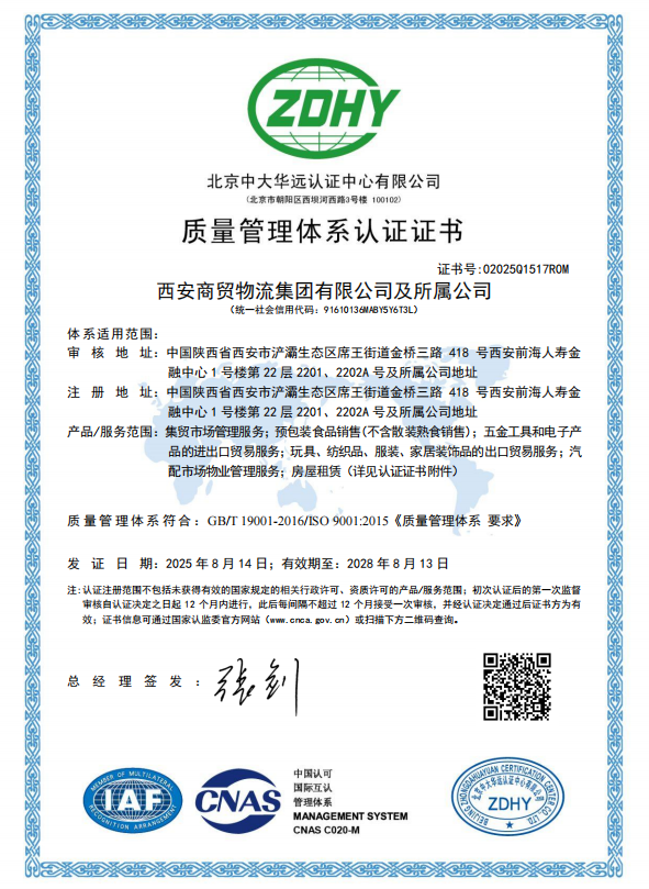 近日,西安商貿(mào)物流集團(tuán)及所屬公司獲得ISO9001質(zhì)量管理體系認(rèn)證證書(shū)。這是集團(tuán)組建成立后在推進(jìn)戰(zhàn)略規(guī)劃、塑造品牌形象、提升國(guó)內(nèi)外綜合實(shí)力進(jìn)程中的又一重要成果,標(biāo)志著集團(tuán)在國(guó)際化、制度化、規(guī)范化管理方面邁上新臺(tái)階。