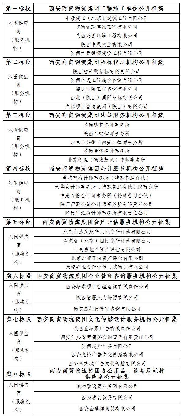 按照我公司關(guān)于西安商貿(mào)物流集團供應(yīng)商(服務(wù)機構(gòu))公開征集的公告及相關(guān)要求,本著公開、公正、公平的原則,經(jīng)過相關(guān)程序,確定以下單位入圍我公司供應(yīng)商(服務(wù)機構(gòu))庫: