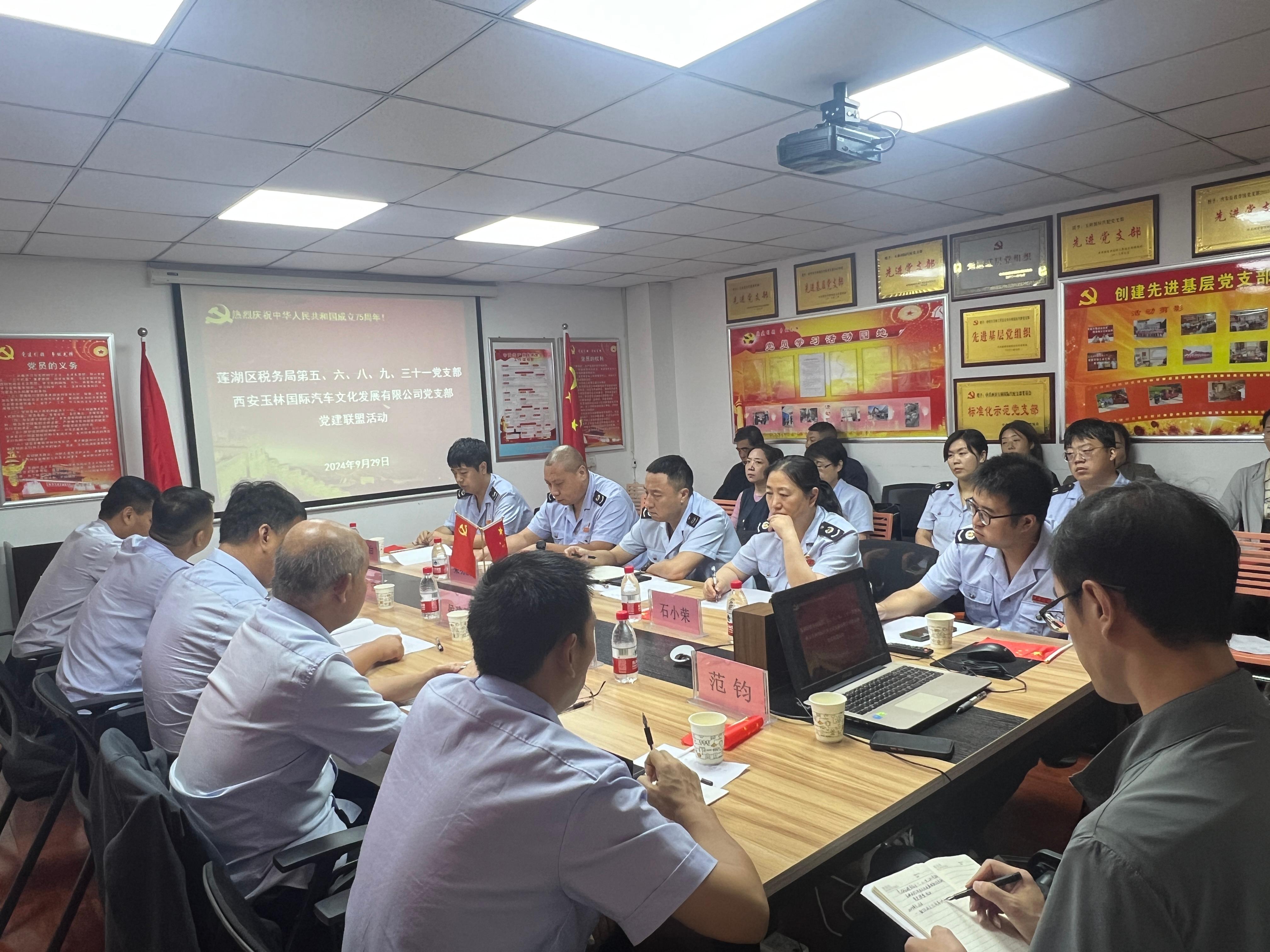 為全面貫徹落實習近平新時代中國特色社會主義思想和黨的二十屆三中全會精神,推動黨紀學習教育常態(tài)化長效化,以新作風、新作為、新成績慶祝中華人民共和國成立75周年。9月29日,西安玉林國際汽配黨支部聯(lián)合西安市蓮湖區(qū)稅務局下屬第五、六、八、九、三十一黨支部圍繞政治建設、紀律建設、業(yè)務交流、營商環(huán)境提升等內(nèi)容開展稅企黨建聯(lián)盟活動。公司黨員代表、環(huán)西稅務所各支部黨員代表、市場商戶代表共計20余人參加了此次活動。